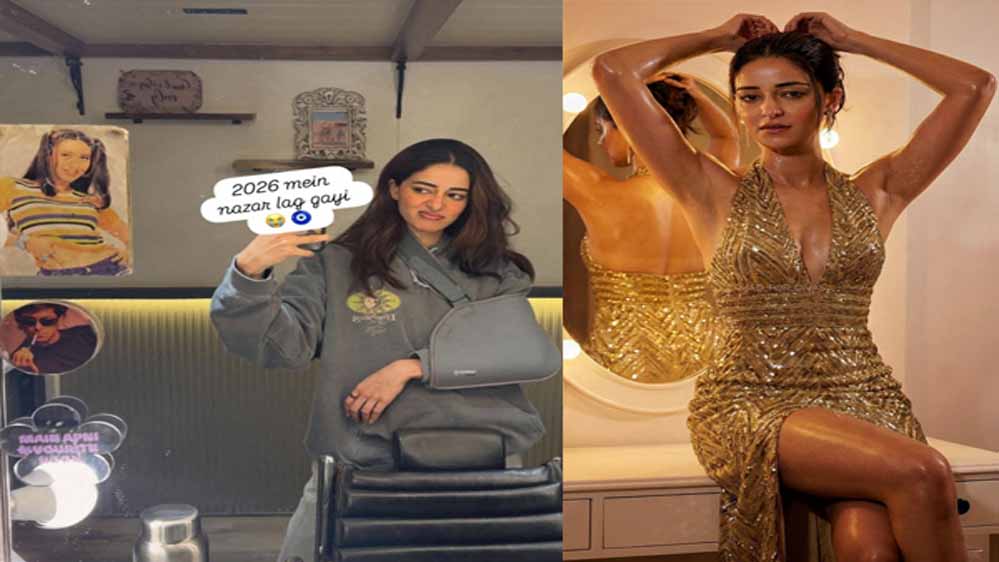 बॉलीवुड एक्ट्रेस अनन्या पांडे ने अपनी वैनिटी वैन से एक मिरर सेल्फी शेयर की। इस मिरर सेल्फी में फैंस को उनके पर्सनल वैनिटी स्पेस की झलक मिली और साथ ही यह भी पता चला कि वह फिलहाल एक चोट से रिकवर हो रही हैं। अपने सोशल मीडिया अकाउंट पर शेयर की गई तस्वीर में, एक्ट्रेस ग्रे ओवरसाइज्ड हुडी पहने और हाथ में स्लिंग लगाए दिखीं, जिससे पता चला कि उन्हें चोट लगी है। उन्होंने तस्वीर पर एक स्टिकर लगाया था जिस पर लिखा था, '2026 में नजर लग गई।'