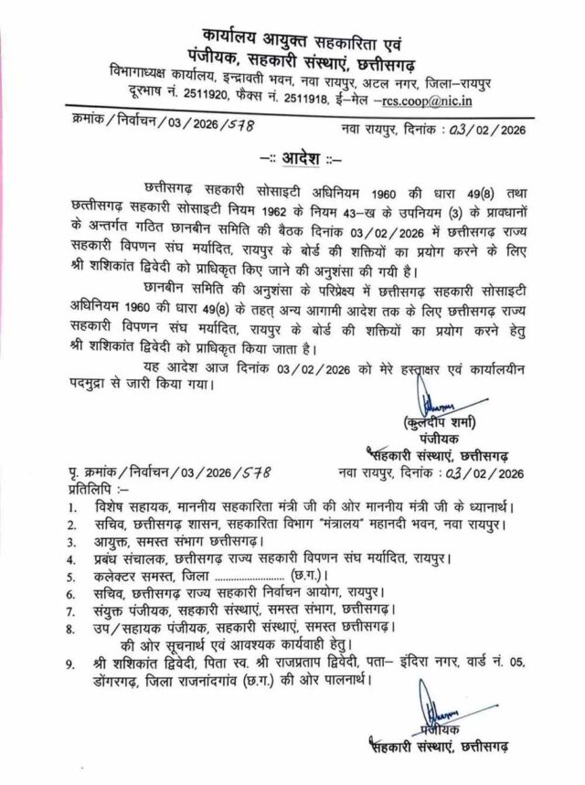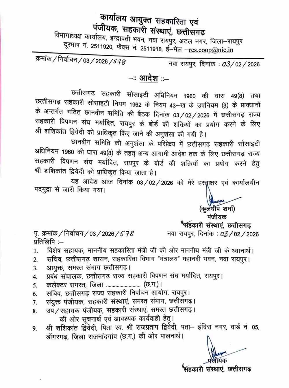 राज्य सहकारी विपणन संघ मर्यादित बोर्ड की शक्तियों का प्रयोग करने शशिकांत द्विवेदी को प्राधिकृत किया गया है, जारी आदेश में लिखा है, छत्तीसगढ़ सहकारी सोसाइटी अधिनियम 1960 की धारा 49 ( 8 ) तथा छत्तीसगढ़ सहकारी सोसाइटी नियम 1962 के नियम 43-ख के उपनियम (3) के प्रावधानों के अन्तर्गत गठित छानबीन समिति की बैठक दिनांक 03/02/2026 में छत्तीसगढ़ राज्य सहकारी विपणन संघ मर्यादित, रायपुर के बोर्ड की शक्तियों का प्रयोग करने के लिए शशिकांत द्विवेदी को प्राधिकृत किए जाने की अनुशंसा की गयी है। छानबीन समिति की अनुशंसा के परिप्रेक्ष्य में छत्तीसगढ़ सहकारी सोसाइटी अधिनियम 1960 की धारा 49 ( 8 ) के तहत् अन्य आगामी आदेश तक के लिए छत्तीसगढ़ राज्य सहकारी विपणन संघ मर्यादित, रायपुर के बोर्ड की शक्तियों का प्रयोग करने हेतु शशिकांत द्विवेदी को प्राधिकृत किया जाता है। यह आदेश आज दिनांक 03/02/2026 को मेरे हस्ताक्षर एवं कार्यालयीन पदमुद्रा से जारी किया गया ।